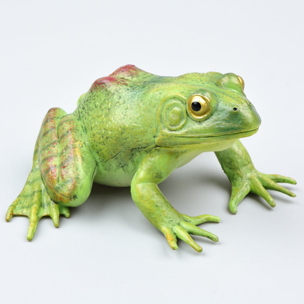 A green frog figurine with a natural pose and expressive details, suitable for home decor or shelf display.